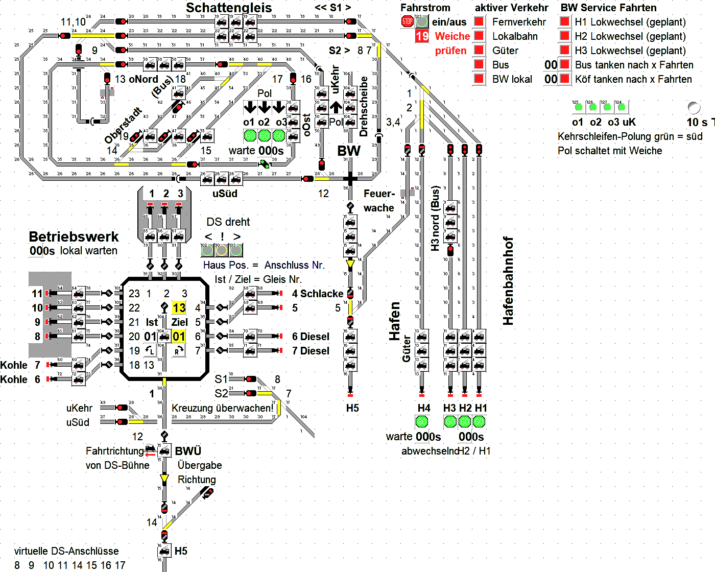 Beim technischen Teil der Anlage war es für mich, als Informatiker, klar, dass alles digital per Computer steuerbar werden sollte. Die Anlage ist mit Zwei-Leiter-DCC-Digitaltechnik ausgestattet. Zur Steuerung dient ein Fleischmann Twin-Center, das eine Version der Intellibox ist. Die Computer-Steuerung erfolgt mit dem Programm WIN-DIGIPET. Technische Besonderheiten sind die digitale Steuerung der Roco-Drehscheibe und des Portalkrans. Einige Schaltungen, wie die automatischen Polwendungen der Drehscheibe und der Kehrschleifen, sowie ein Watchdog, der bei Ausfall der PC-Steuerungssignale alle Züge anhält und eine digitale Kurzschluss-Anzeige der betreffenden Blocknummer sind eigene Entwicklungen. Das Digitalmodul zur Drehscheibe kam von einer Firma aus Österreich und wird leider nicht mehr hergestellt. Roco selbst hält es scheinbar nicht für notwendig, ein digitales Steuermodul anzubieten.