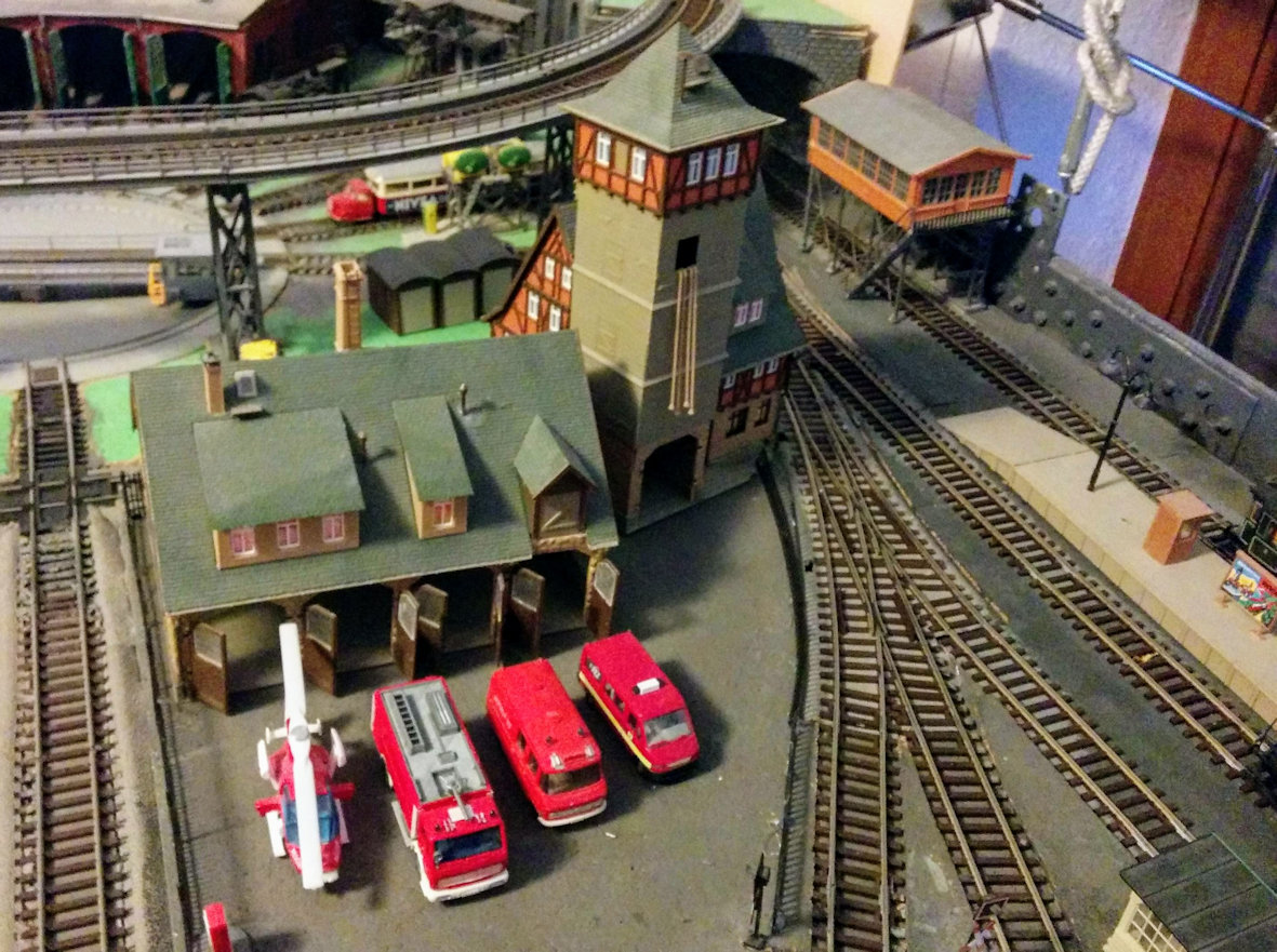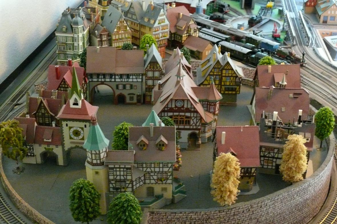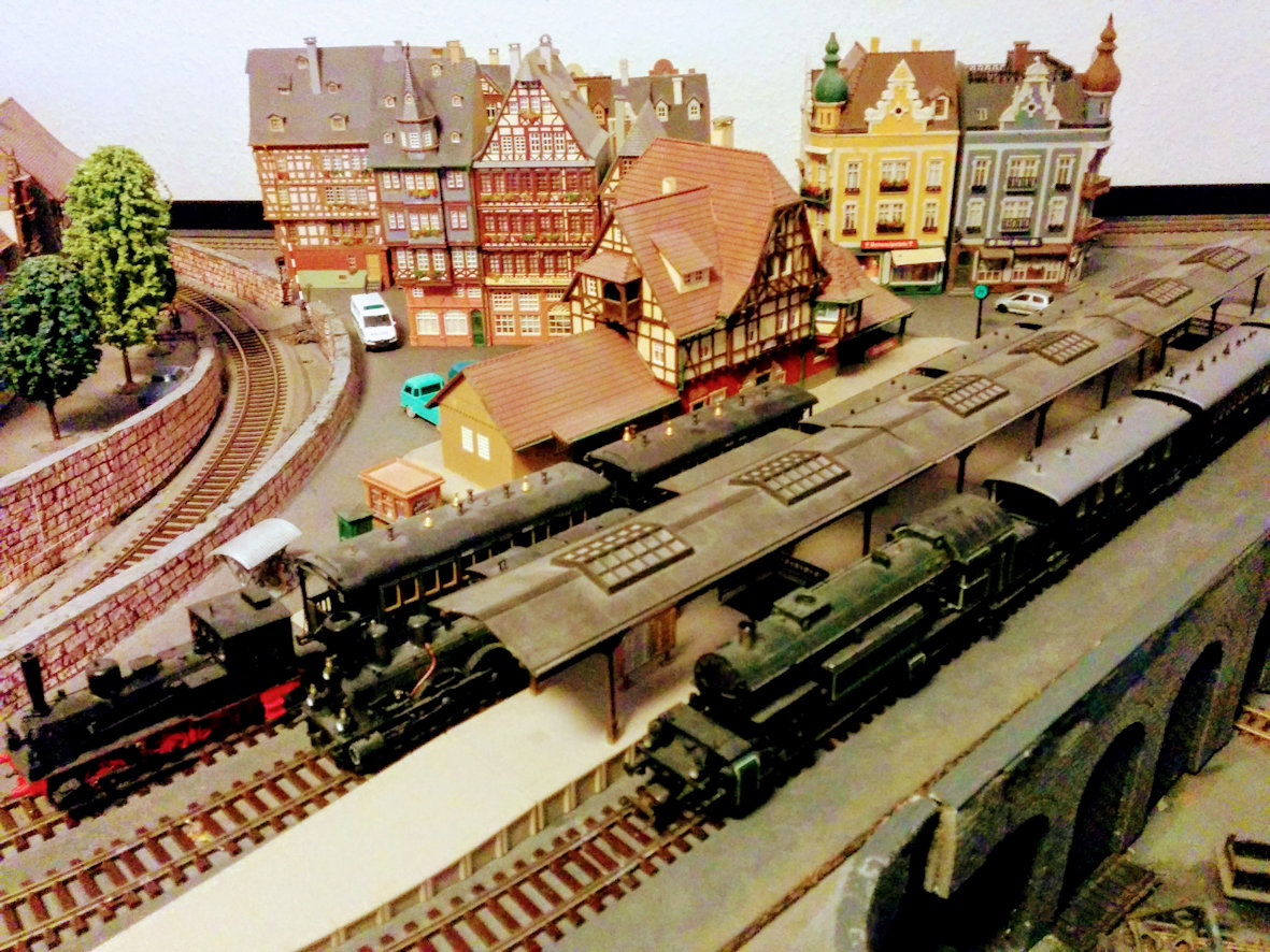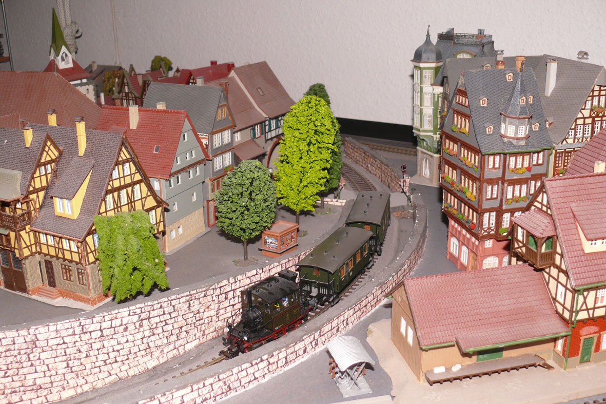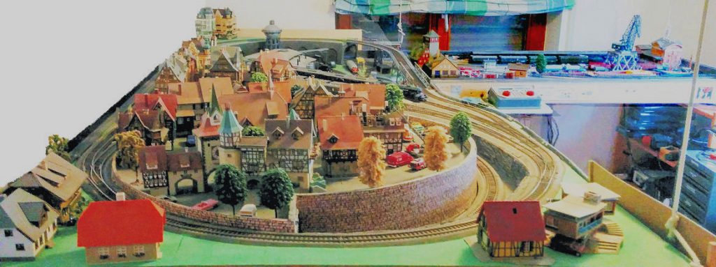 Die Gestaltung der Anlage war bei so wenig Platz schwierig. Die geringe Größe sollte durch technisch und thematisch interessante Gestaltung kompensiert werden. Eine Landschaft würde bei der kleinen Anlage nicht wirken. Daher setzten wir städtebauliche Schwerpunkte auf Bahnhof, Betriebswerk und Hafen mit Verladekran. Eine Feuerwache durfte nicht fehlen, da mein Sohn in der Jugendfeuerwehr war. Das größte Problem war, das Gleiswendel zu tarnen, da kein Berg möglich war. Es wurde zum Stadtgraben einer mittelalterlich befestigten Stadt. In dieser Altstadt sind u. a. das Rathaus von Konstanz/Allmansdorf und das Martinstor aus Freiburg zu erkennen. Der Bahnhof der Oberstadt stammt aus Neuffen.