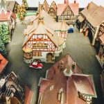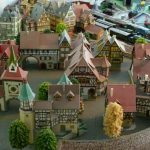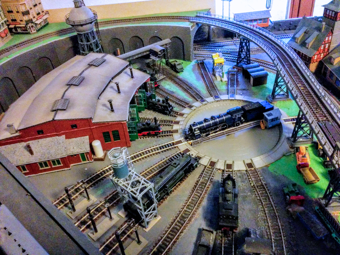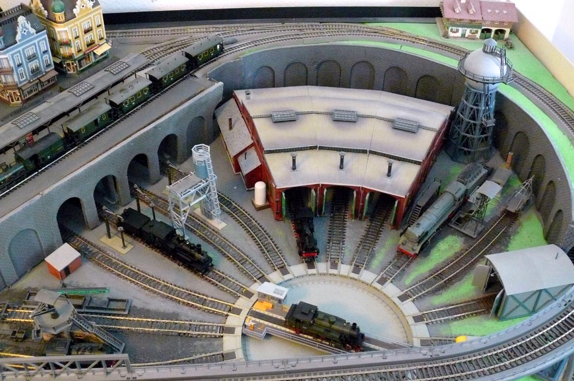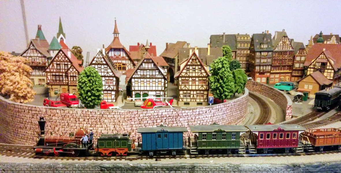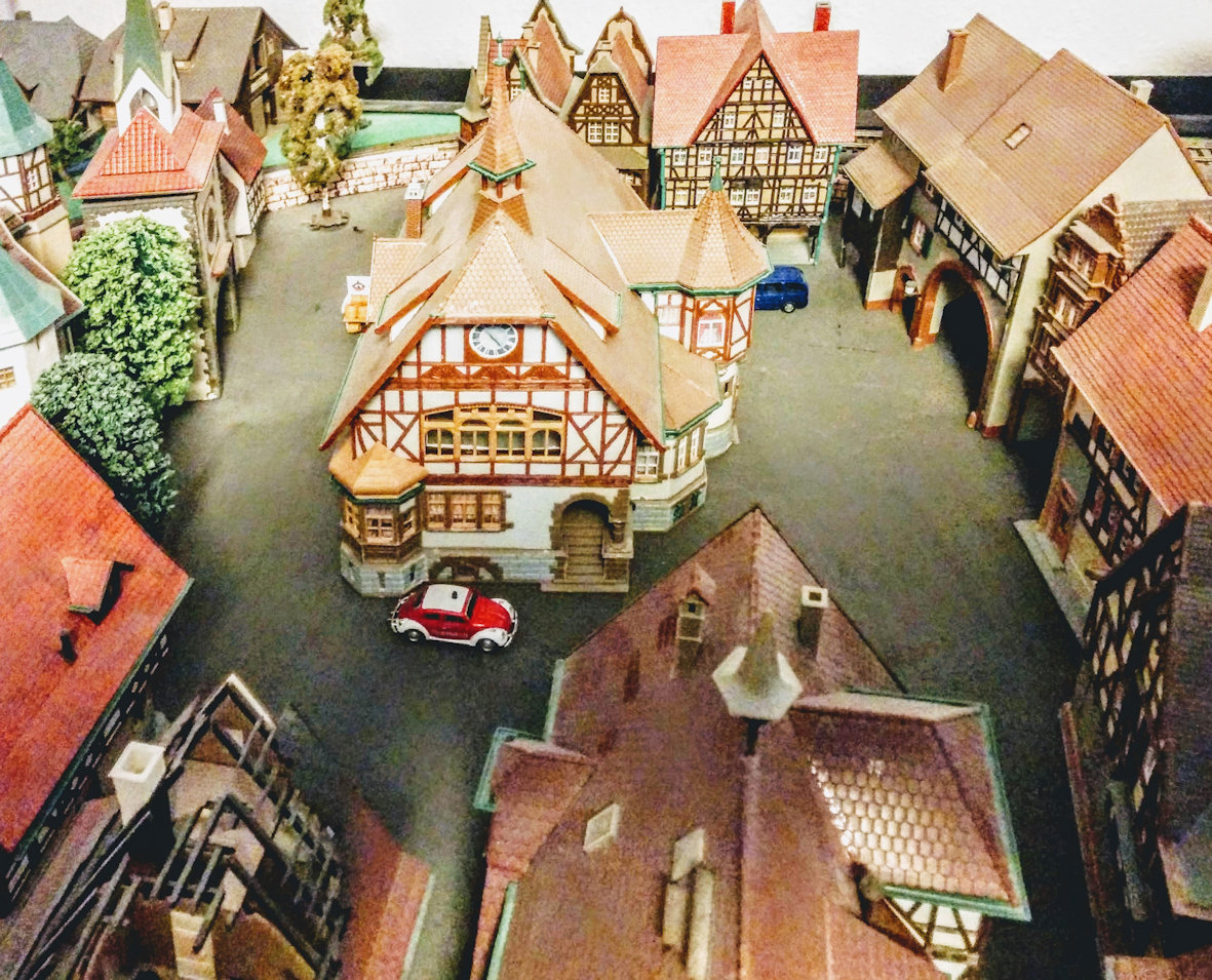Die Gestaltung der Anlage war bei so wenig Platz schwierig. Die geringe Größe sollte durch technisch und thematisch interessante Gestaltung kompensiert werden. Eine Landschaft würde bei der kleinen Anlage nicht wirken. Daher setzten wir städtebauliche Schwerpunkte auf Bahnhof, Betriebswerk und Hafen mit Verladekran. Eine Feuerwache durfte nicht fehlen, da mein Sohn in der Jugendfeuerwehr war. Das größte Problem war, das Gleiswendel zu tarnen, da kein Berg möglich war. Es wurde zum Stadtgraben einer mittelalterlich befestigten Stadt. In dieser Altstadt sind u. a. das Rathaus von Konstanz/Allmansdorf und das Martinstor aus Freiburg zu erkennen. Der Bahnhof der Oberstadt stammt aus Neuffen.