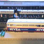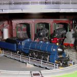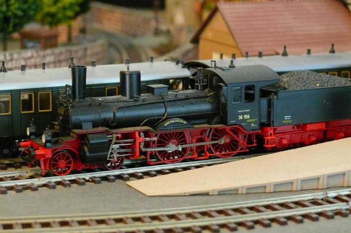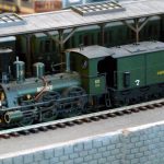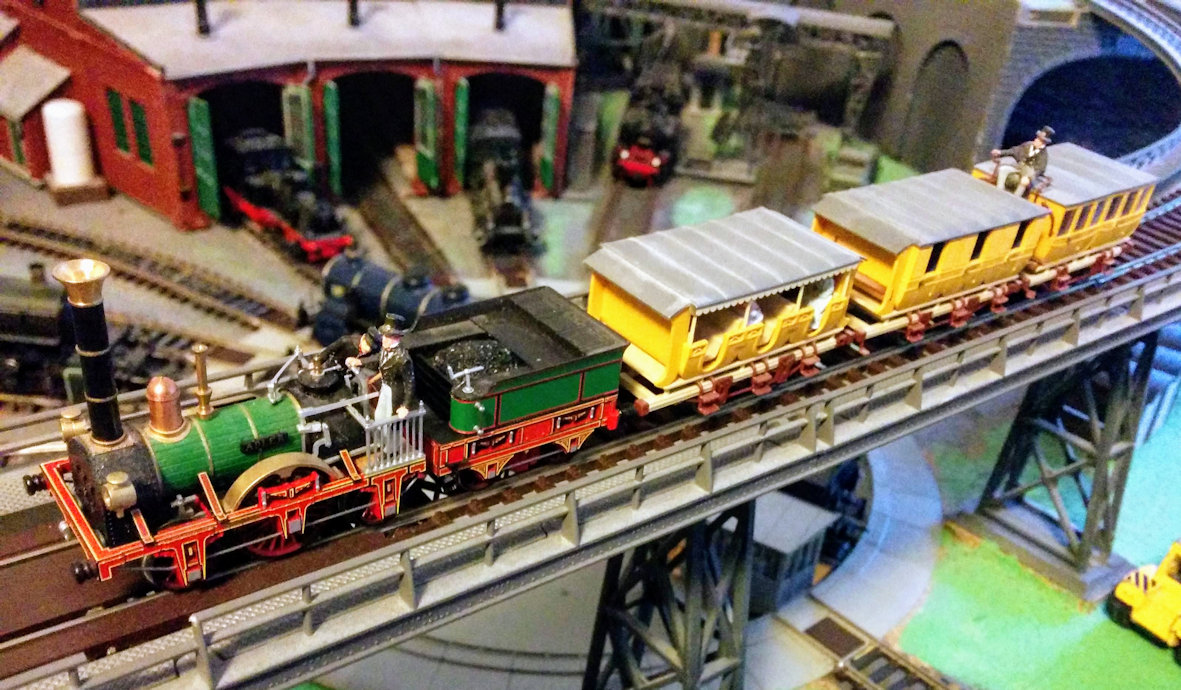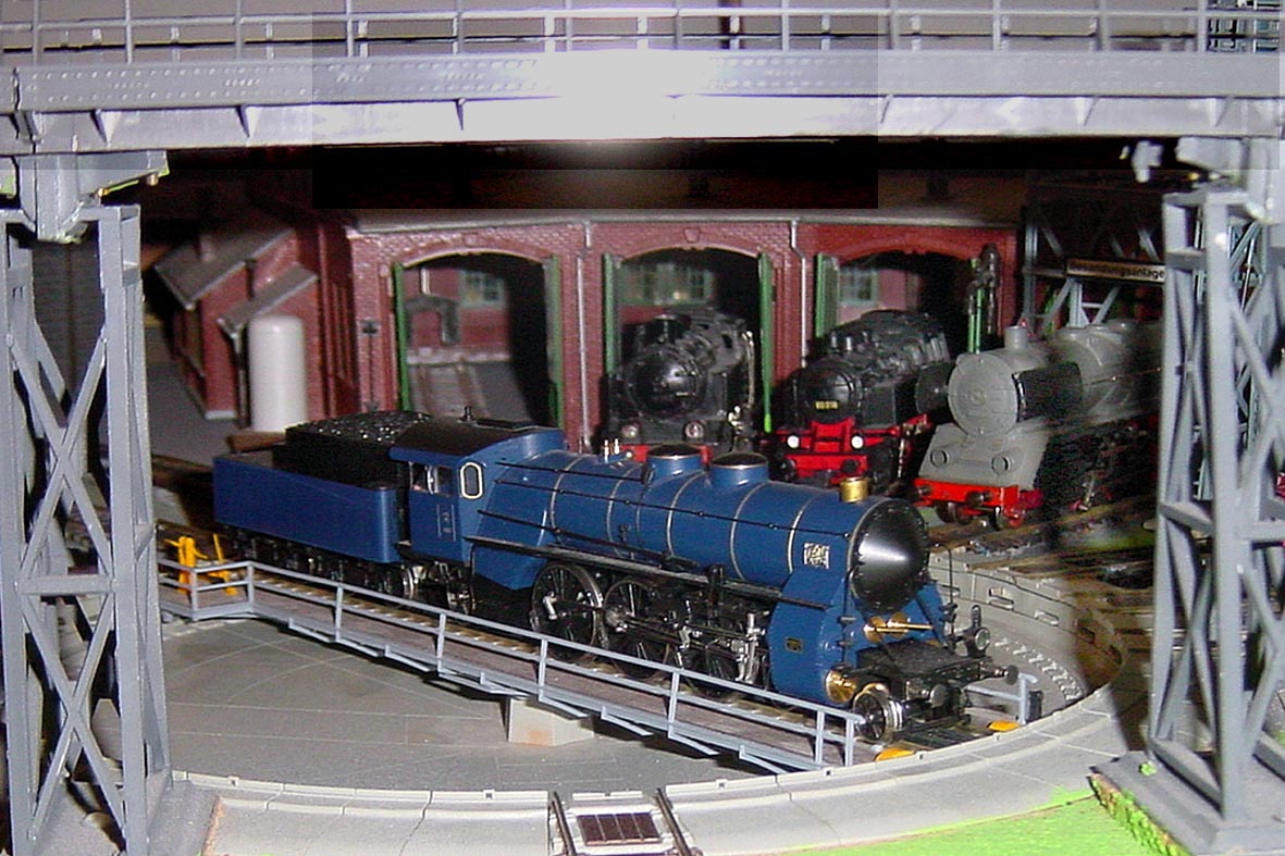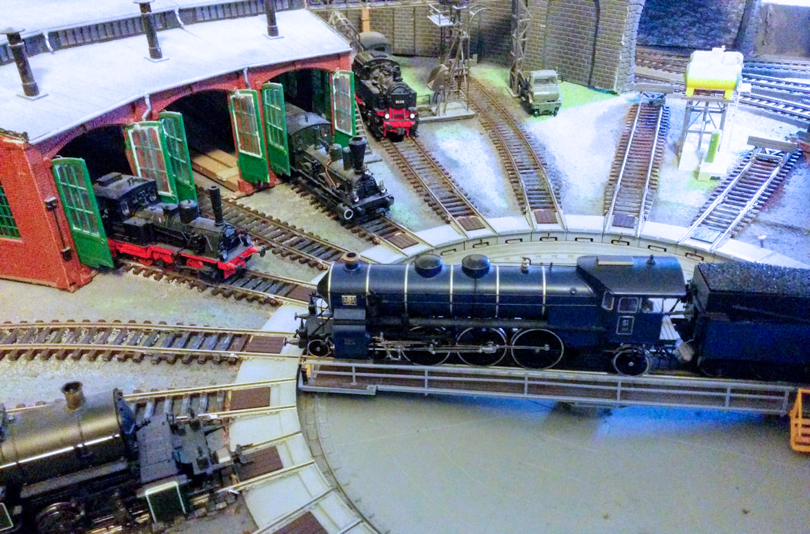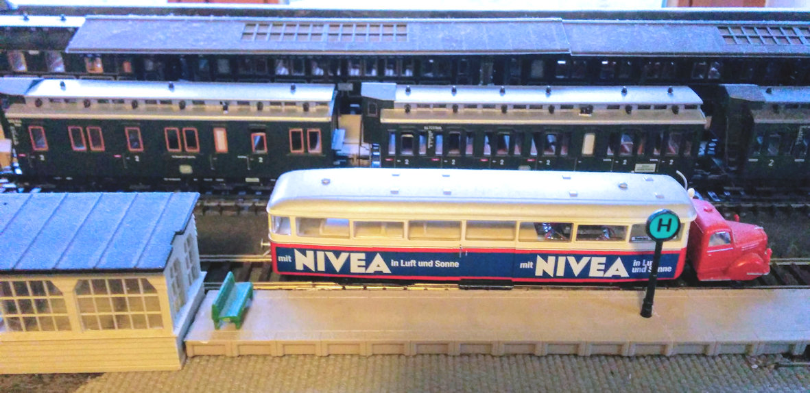 Das rollende Material musste sich auf kurze Züge mit kurzen Wagen für kleine Gleisradien beschränken. Daher wählten wir die Anfänge der Eisenbahnzeit. Optische Leckerbissen sollten die kleine Anlage auch bei der Zugzusammenstellung aufwerten. So fahren z. B. gelegentlich Museumszüge der ersten Eisenbahnen in Deutschland (Adler) und der Schweiz (Limnat, Spanisch Brötlibahn genannt). Das bayerische Glaskasterl versieht dagegen noch seinen Dienst im Regelbetrieb. Eine Besonderheit ist auch eine Lok mit seitlich angebrachten Zylindern und Kraftübertragung durch Kardanwellen statt Stangen. Diese Lok kann daher sehr enge Kurven befahren und wurde bei Waldbahnen in Amerika eingesetzt. Sie ist auf dieser Seite oben als Symbol mit einem Link zur Bildergalerie zu sehen. Dann ist noch meine Kindheitserinnerung an die Sylter Inselbahn dabei. Der umgebaute Borgward Sattelschlepper fuhr von 1952 bis 1970 durch die Dünen zwischen Hörnum nach List.